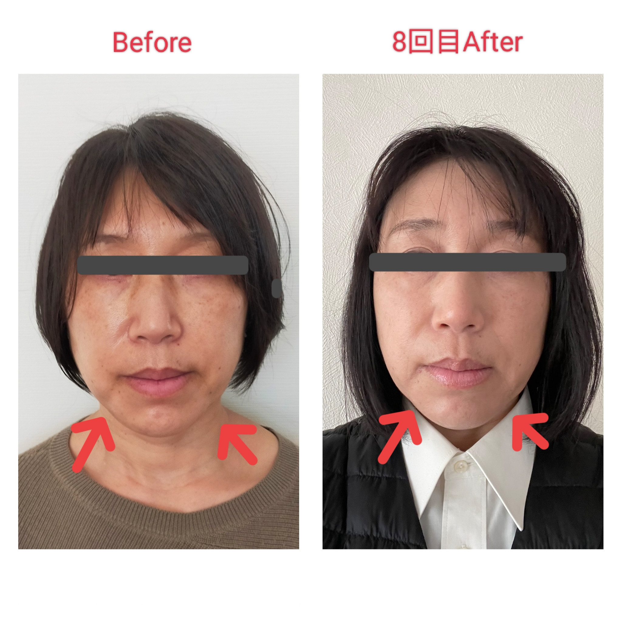 終わってすぐは肌触りの変化に驚き、翌朝の自撮りした写真を見ると、気になっていた左側はすっきり!今度は右側のエラの張り(噛み癖あり)の方が気になるように!